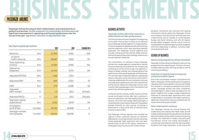 The design responds with a disciplined grid, generous white space, and a restrained palette of cool blues and neutrals to establish order, trust, and confidence. Strong typography and subtle callouts support Lufthansa’s assured, strategic voice, while the line graphics throughout create a visual journey. Together, these choices prioritize legibility and hierarchy, aligning the report with Lufthansa’s premium positioning and customer expectations.